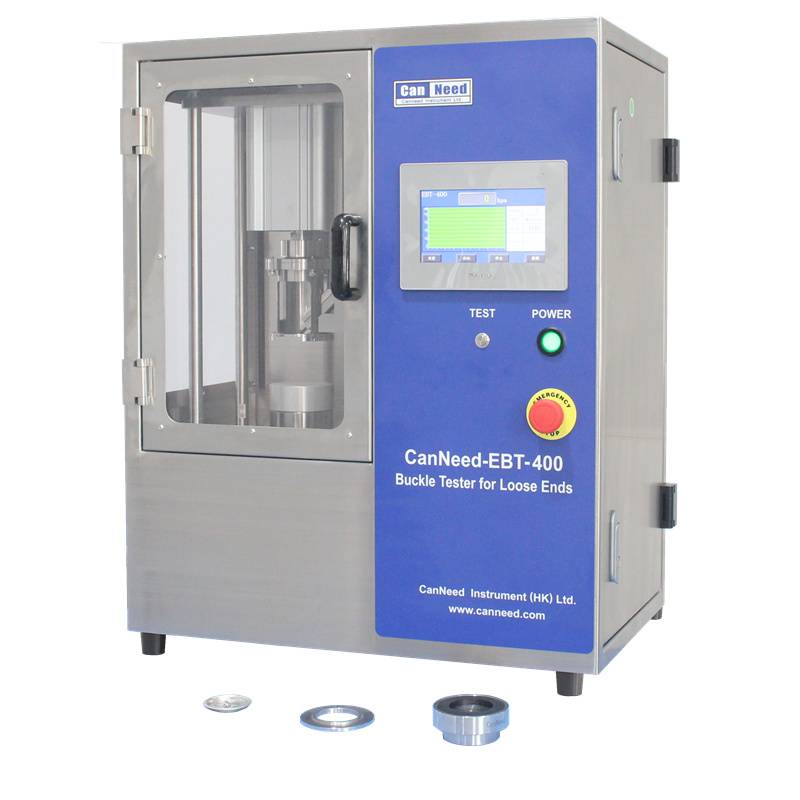 The CanNeed-EBT-400 Buckle Tester for Loose ends is for testing the exact pressure at which the end buckles. Any end of varying diameter may be tested: change parts are available that can be exchanged within seconds. Three testing modes: “Buckle Test”, “Missile Test”, and “Score Burst Test”.
